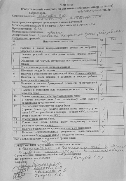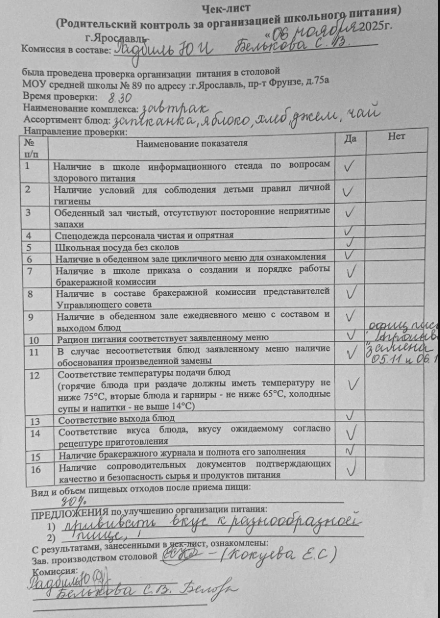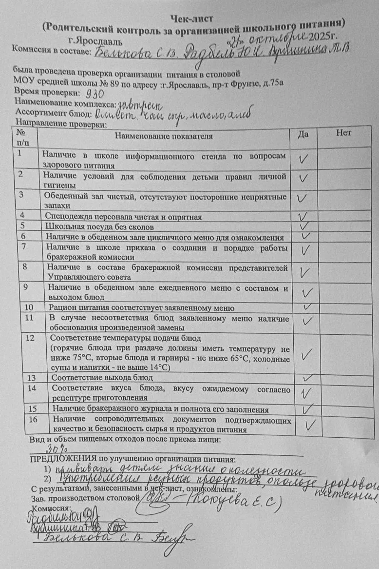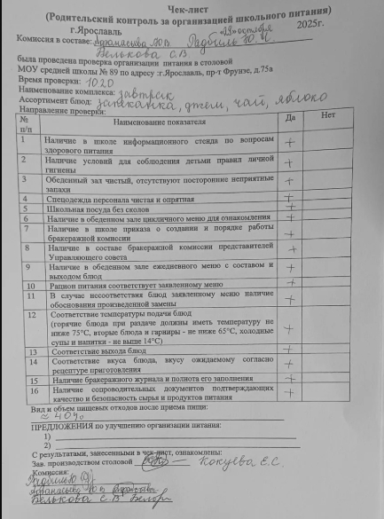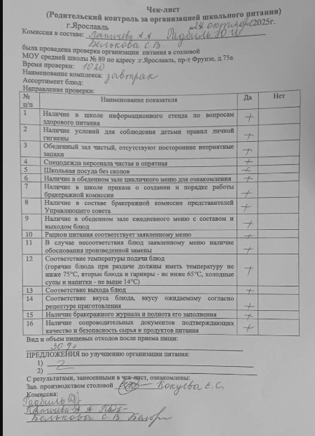 В МОУ средней школе № 89 родители-волонтеры проводят родительский контроль за оказанием услуги по предоставлению горячего питания обучающимся 1-11 классов.